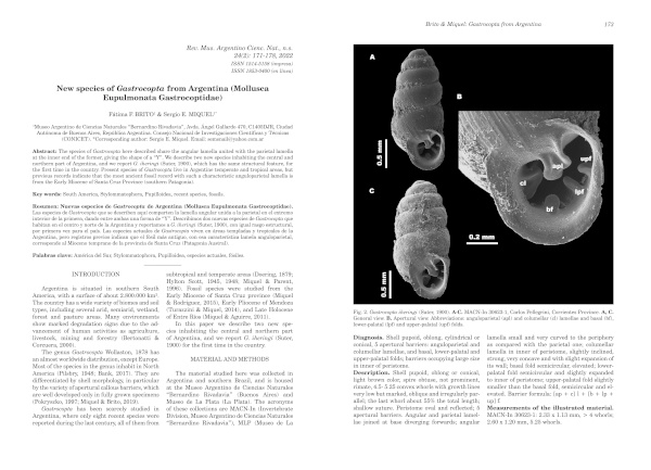 at the inner end of the former, giving the shape of a “Y”. We describe two new species inhabiting the central and northern part of Argentina, and we report G. iheringi (Suter, 1900), which has the same structural feature, for the first time in the country. Present species of Gastrocopta live in Argentine temperate and tropical areas, but previous records indicate that the most ancient fossil record with such a characteristic anguloparietal lamella is from the Early Miocene of Santa Cruz Province (southern Patagonia).