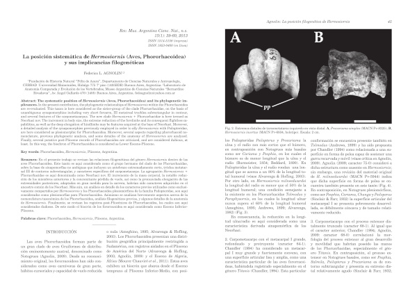 The systematic position of Hermosiornis (Aves, Phororhacoidea) and its phylogenetic implicances.In the present contribution, the phylogenetic relationships of Hermosiornis within the Phororhacoidea