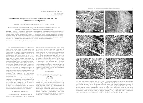 A new genus and species, Amosioxylon australis, based on an anatomically preserved stem from the Late Carboniferous Jejenes Formation, Argentina, is described. The specimen is six cm in diameter and has some features usually found in pteridosperms, including the presence of several vascular segments surrounded by secondary xylem. The pycnoxylic wood resembles progymnosperms and the tissue between the vascular strands, with reticulate thickenings and pits, is similar to the transfusion tissue found in extant conifers and cycads. According to the available evidences a relationship with primitive pteridosperms is suggested.Descargas