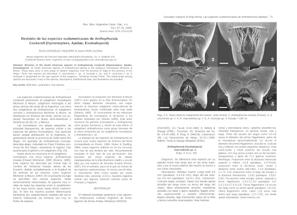 Revision of the South American species of Anthophorula Cockerell (Hymenoptera, Apidae, Exomalopsini). All South American species of Anthophorula belong to the subgenus Isomalopsis Michener & Moure. These bees occur in xeric areas of western Argentina, from the province of Salta to the province of Río Negro. Three new species are described: A. macrodonta n. sp., A. truncata n. sp., and A. uncicornis n. sp. A lectotype is designated for the type species of the subgenus, Tetralonia niveata Friese. The relationships among species are discussed. A key to the species, descriptions, distributional data, and illustrations are provided.Descargas