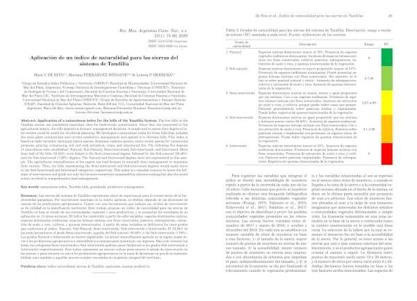Las sierras del sistema de Tandilia representan sitios de importancia para la conservación de la biodiversidad pampeana. Por encontrarse inmersas en la matriz agrícola, su destino depende de las decisiones de manejo de los productores agropecuarios. Contar con una herramienta que indique sus niveles de intervención es de utilidad en la planificación territorial. Este trabajo propone un índice de naturalidad para las sierras de Tandilia en base al estado de sus comunidades vegetales y usos productivos, y se presentan los resultados de su aplicación en 13 áreas serranas. El índice fue construido a partir de ocho variables: especies dominantes nativas, especies dominantes endémicas, especies leñosas exóticas con fines comerciales, pastoreo, sobrepastoreo, extracción de suelo y roca, cultivos, y quemas intencionales. A partir de estas variables se definieron los cinco grados que conforman el índice: Natural, Sub-Natural, Semi-intervenido, Sub-intervenido e Intervenido. El 53.84% de las áreas presentaron el grado Semi-intervenido, seguido del Sub-natural (38.46%) y del Sub-intervenido (7.69%). Los grados Natural e Intervenido no fueron registrados. La actual intensificación agrícola en la región puede llevar a los productores agropecuarios a intensificar sus manejos para maximizar sus ingresos. Bajo este contexto las áreas con categorías Semi-intervenido y Sub-intervenido podrían pasar fácilmente a los grados Sub-intervenido e Intervenido respectivamente. Este índice representa un recurso valioso para conocer el estado de intervención de las sierras, y para orientar no solo a los productores agropecuarios en la toma de decisiones en pos de su sustentabilidad, sino también a aquellos actores sociales vinculados en la gestión integral del territorio.
