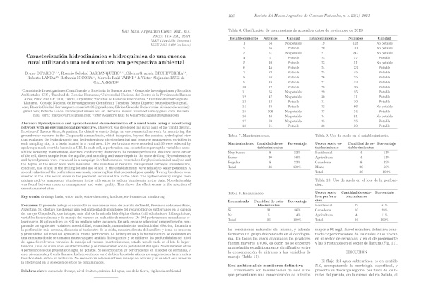 El presente trabajo se desarrolló en una cuenca rural del partido de Tandil, Provincia de Buenos Aires, Argentina. Su objetivo fue diseñar una red ambiental de monitoreo del recurso hídrico subterráneo en la cuenca del arroyo Chapaleofú, que integre, más allá de la mirada hidrológica clásica (hidrodinámica e hidroquímica), variables fisicoquímicas y de manejo del recurso en cada sitio de muestreo.