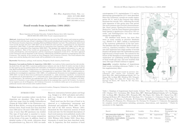 tions have dealt with this type of fossil. A database of 324 records including fossil woods from the Carboniferous to the Pleistocene found in Argentina (including Malvinas/Falkland Islands) was built. The publications about fossil wood records through 134 years (1884–2021) can be divided into three periods, i) publications by non-Argentine researchers (1884–1940), ii) sporadic publications by researchers from Argentina (1941–1999), and iii) frequent publications by researchers from Argentina (2000–2021). The database has updated information (i.e., age, synonyms, repository). Most of the records are gymnosperms (57 %, including among others, conifer-like woods, cycads, pteridosperms, and corystosperms), and the remaining are angiosperm woods (43 %). The latter appeared in the Cretaceous and are dominant in the Cenozoic, reflecting the worldwide expansion of angiosperms since the