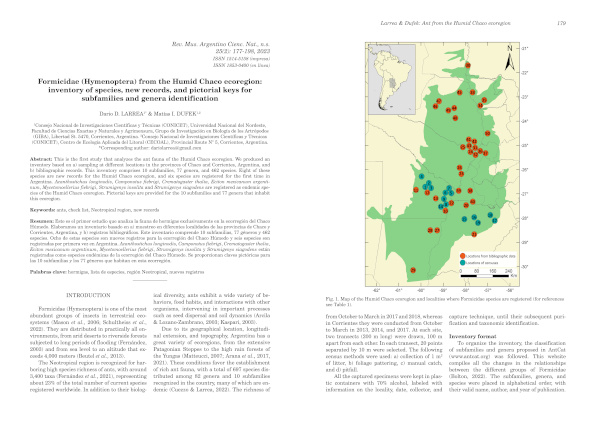 inventory based on a) sampling at different locations in the provinces of Chaco and Corrientes, Argentina, and b) bibliographic records. This inventory comprises 10 subfamilies, 77 genera, and 462 species. Eight of these species are new records for the Humid Chaco ecoregion, and six species are registered for the first time in Argentina. Acanthostichus longinodis, Camponotus fiebrigi, Crematogaster thalia, Eciton mexicanum argentinum, Mycetomoellerius fiebrigi, Strumigenys insolita and Strumigenys siagodens are registered as endemic species of the Humid Chaco ecoregion. Pictorial keys are provided for the 10 subfamilies and 77 genera that inhabit this ecoregion.