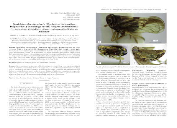 Neodelphax fuscoterminata (Hemiptera: Fulgoroidea: Delphacidae) y su enemigo natural Anagrus incarnatosimilis (Hymenoptera: Mymaridae), primer registro sobre frutos de manzano.