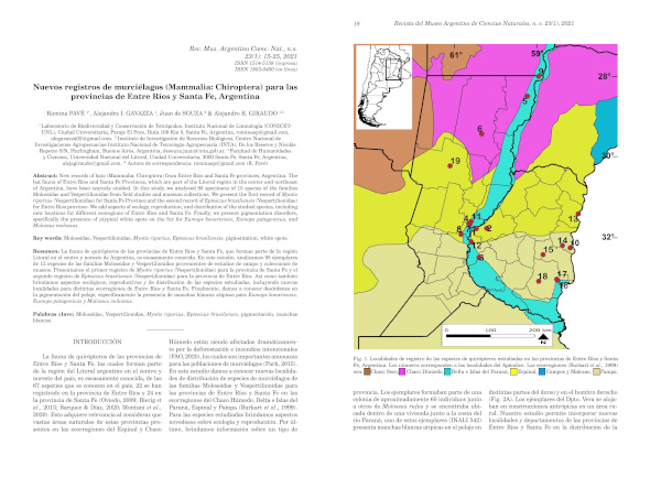 Pavé, R., M. A. Cristaldi, M. E. Rodríguez, R. M. Barquez, A. I. Gavazza & A. R. Giraudo. 2017. Nuevos registros de murciélagos para la provincia de Santa Fe, Argentina. Mastozoologia Neotropical 24: 153-162.